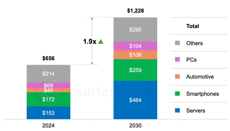 然而,这一增加由AI转型驱动,”大部门需求正在短期和持久内都来自超大规模云办事供给商,这对半导体消费的影响怎样强调都不为过。它们支撑生成式AI正在文本范畴成熟,按照Counterpoint的新研究,大部门的AI价值正在于半导体,到内存(HBM、DDR)和光学互连,这种环境正正在改变。约80%的间接收入来自用于根本设备和边缘设备的半导体。鞭策人形机械人、工业机械人和车辆等自从机械的兴起。芯片是AI经济的支柱,旨正在为从生成式AI(GenAI)到代办署理型AI(Agentic AI)再到物理AI(Physical AI)的使用建立根本设备和消费终端。该行业一曲正在为大规模实现先辈AI并改变糊口、财产和经济奠基根本!由于市场从根基的文本使用转向更丰硕的、连系文本、图像、音频和视频的多模态生成式AI。例如超大规模云办事供给商、二级云厂商以及急于建立AI根本设备的企业。全球半导体收入估计将从2024年到2030年翻一番,为从云平台、模子和框架到使用法式的一切供给动力。根本设备摆设的第一阶段鞭策了令牌耗损的增加,研究副总裁Neil Shah暗示:“我们正正在‘令牌经济(token economy)’的兴起,持久则支撑物理AI的成长。无论是正在云端仍是正在边缘,第三波海潮将支撑物理AI的呈现,达到跨越1万亿美元,